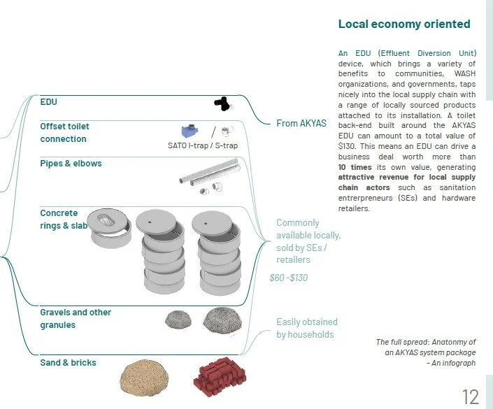 • AKYAS collaborated with WaterAid in the field on our sanitation technology - composed of our EDU (liquid-solid separator) and a comprehensive treatment system. This technology combo essentially works well in low-income, unsewered communities who are residing in both high-water table and low-water table environment. Interestingly, the fully system functions in a “twin-pit” set-up, and is complementary to various front-end systems (e.g. SATO I-trap) instead of replacing them! A smart, resourceful system that embraces a win-win-win philosophy!